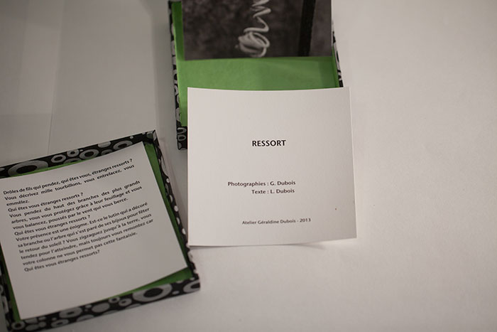 Le premiére version des textes en boîte est épuisée. Une seconde version reprenant les mémes caractéristiques a été publiée. Le format est légérement plus grand 15x15 et le texte et les photographies sont différents de la premiére version. Ressort a été renommé Noeud.